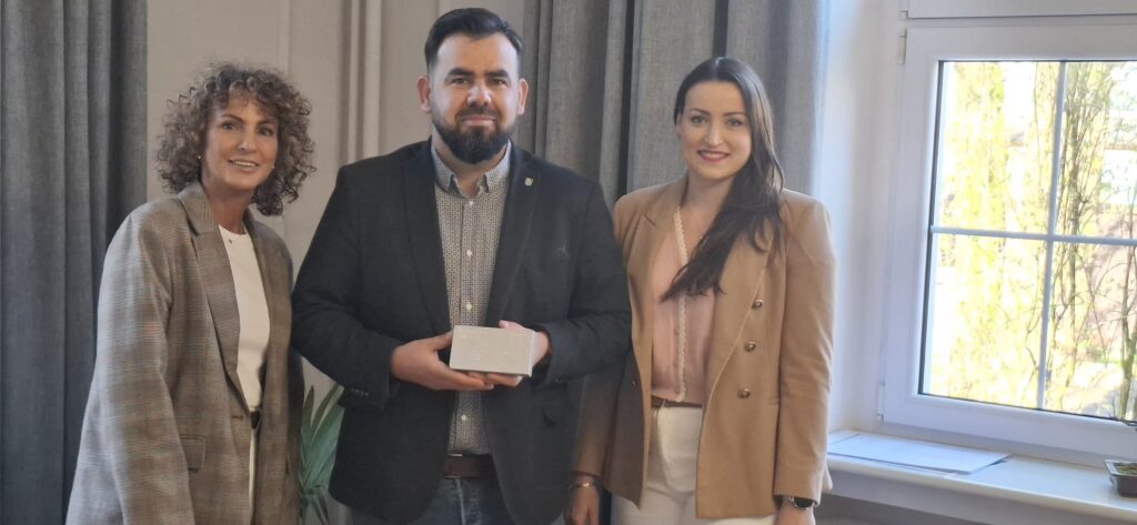 Dziś, 20 kwietnia 2026 r., Starosta Powiatu Lęborskiego Tomasz Litwin przyjął wizytę przedstawicielek Zespołu Szkół Mechaniczno-Informatycznych im. prof. H. Mierzejewskiego w Lęborku: koordynator projektu Erasmus+ Doroty Richert oraz głównej księgowej szkoły Doroty Dybowskiej.