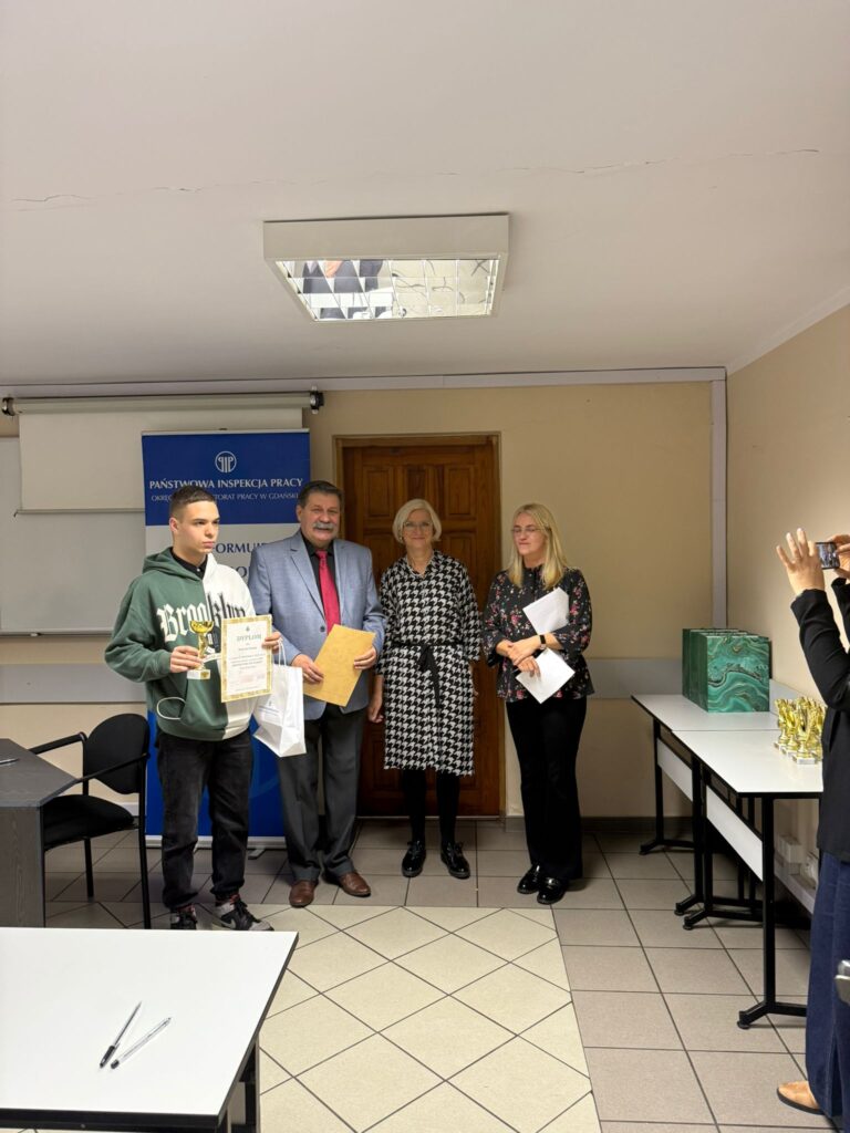 Celem konkursu jest popularyzowanie wiedzy z zakresu podstawowych przepisów prawnej ochrony pracy oraz zasad bezpieczeństwa i higieny pracy wśród uczniów zawodu w rzemiośle. Do konkursu przystąpiło łącznie 8 kandydatów z Cechów Rzemiosł Różnych w Lęborku oraz Słupsku. Naszą szkołę reprezentowało 2 uczniów: Patryk Naczk z klasy IIg – mechanik pojazdów zawodowych oraz Antoni Narewski uczeń z II klasy wielozawodowej- lakiernik samochodowy. Konkurs składał się z dwóch etapów: I etap pisemny polegał rozwiązaniu testu składającego się z 40 pytań, a II etap ustny – udzielenie odpowiedzi na 3 pytania. Pierwsze miejsce zajął uczeń Patryk Naczk, a uczeń Antoni Narewski miejsce czwarte. Zwycięzca Etapu Regionalnego w dniu 2 grudnia 2025r. Patryk weźmie udział w Konkursie Ogólnopolskim w Warszawie.